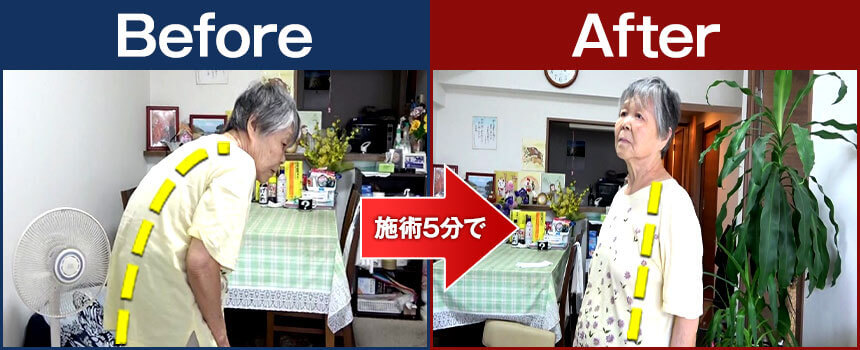 先生の手技を受けると、背中がピンと真っ直ぐ伸び、スタスタ歩けるように!あまりの施術効果に「いつもは前かがみにならないと歩けなかったのに…!」と言い、興奮しながら家の周りを歩き回っておりました。