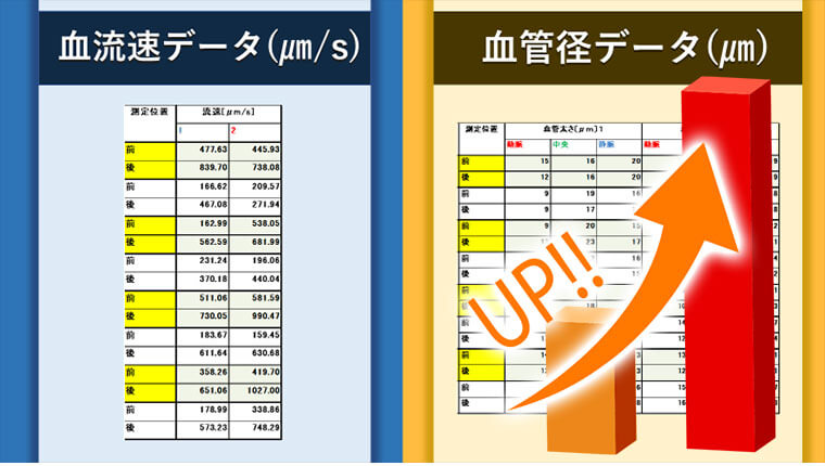 結果として、被験者全員に血流速度の上昇が見られ、中には419μm/sから、施術後に2倍以上の1027μm/sを記録した事例もありました。
