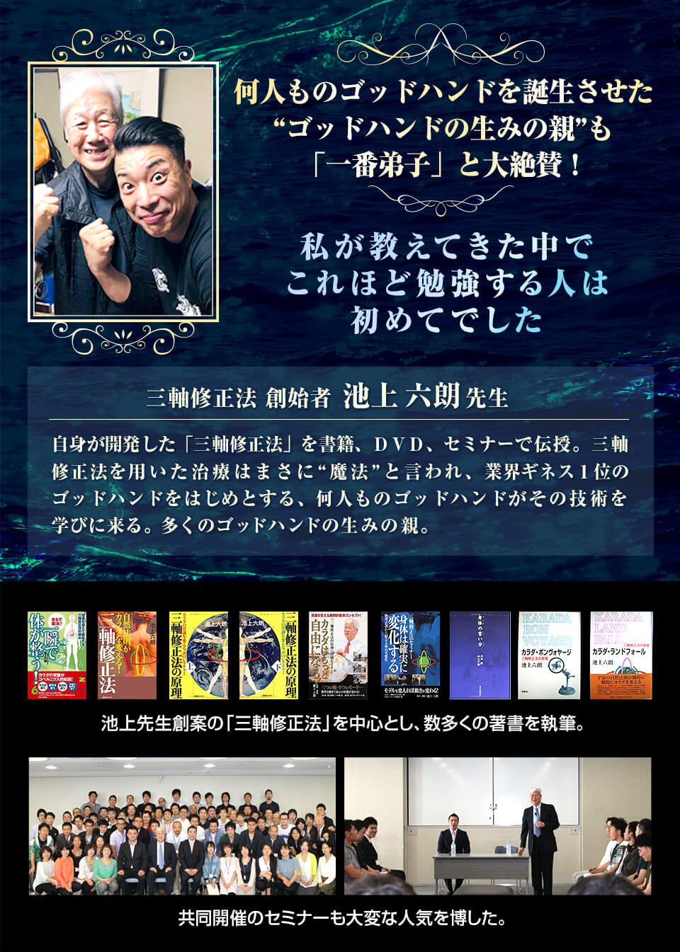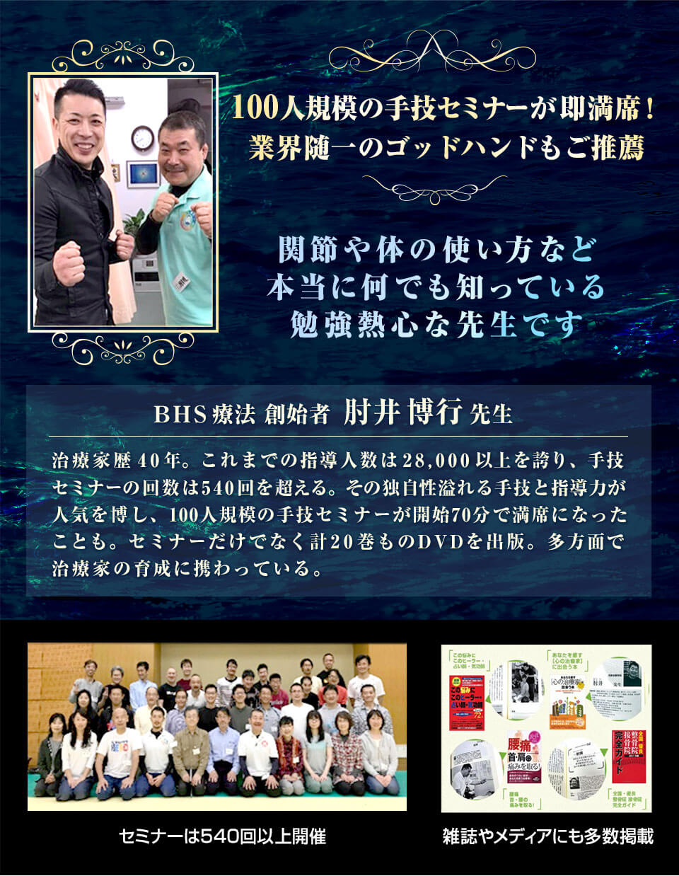 よく、「確かに治療効果はスゴイんだけど、実際結果を出しているのは開発者のみで、弟子たちは結果を出せていない…」という手技もありますが、この治療法であれば学んだ人全員が、即日「ゴッドハンド」「治療の達人」になれるのです。
